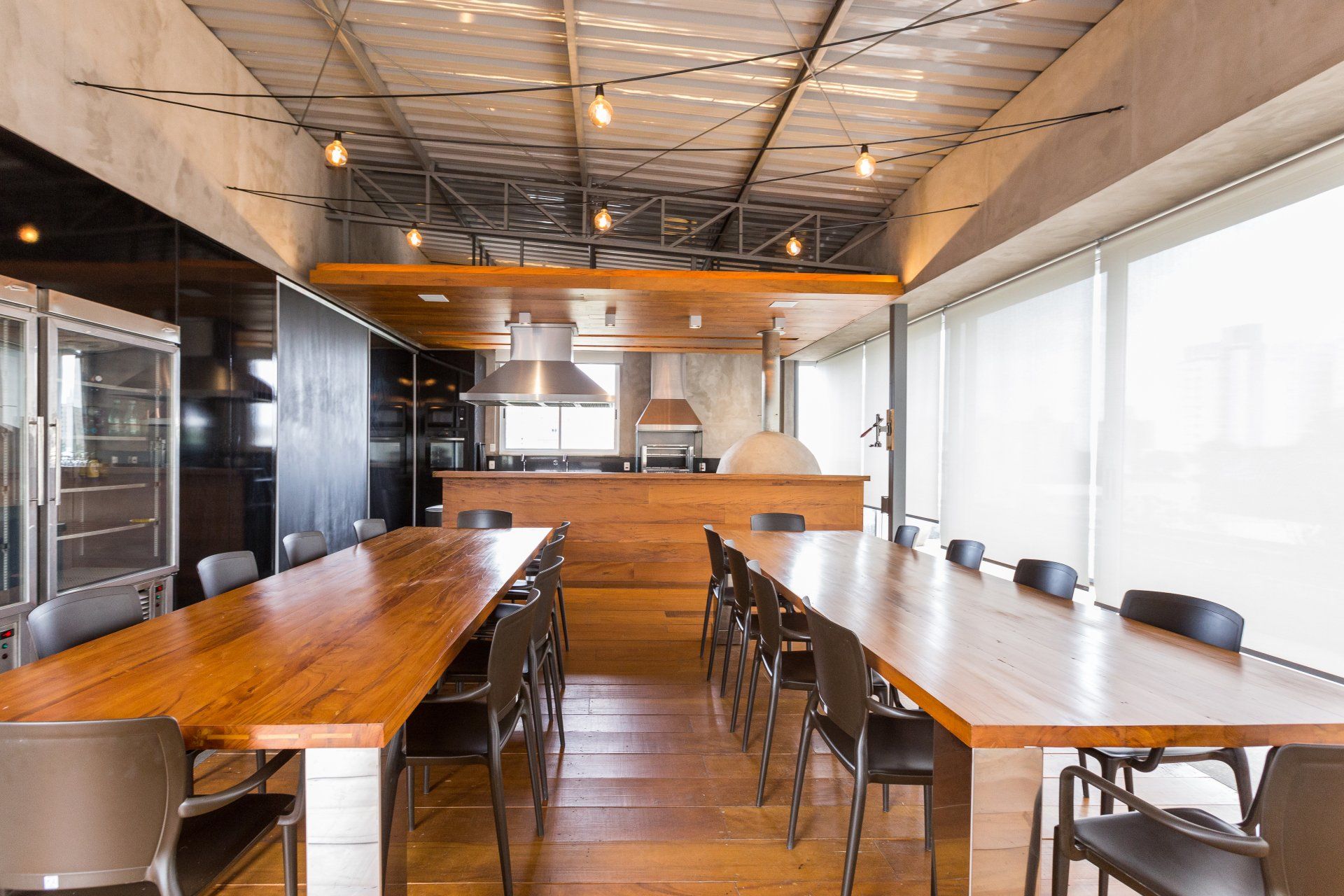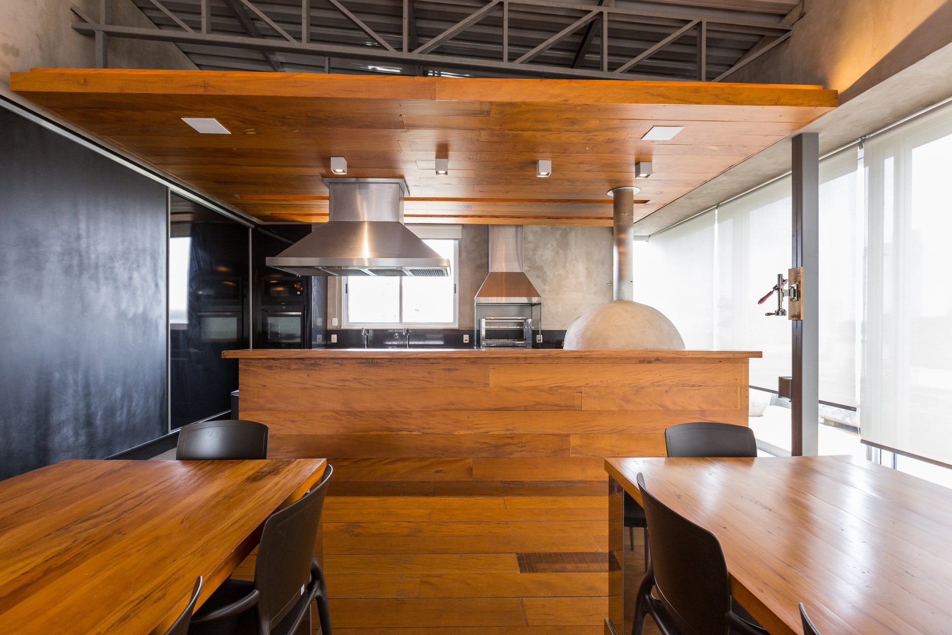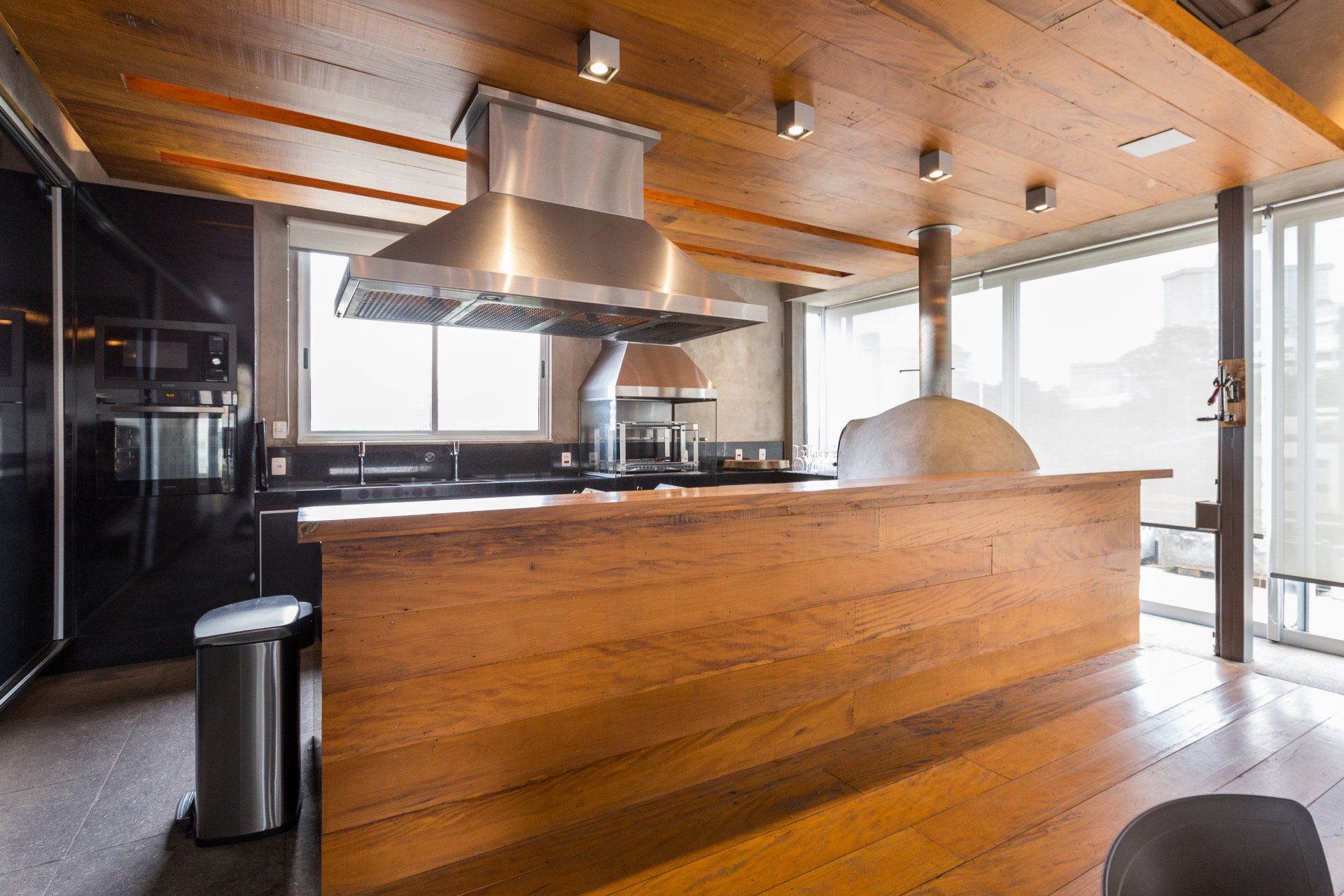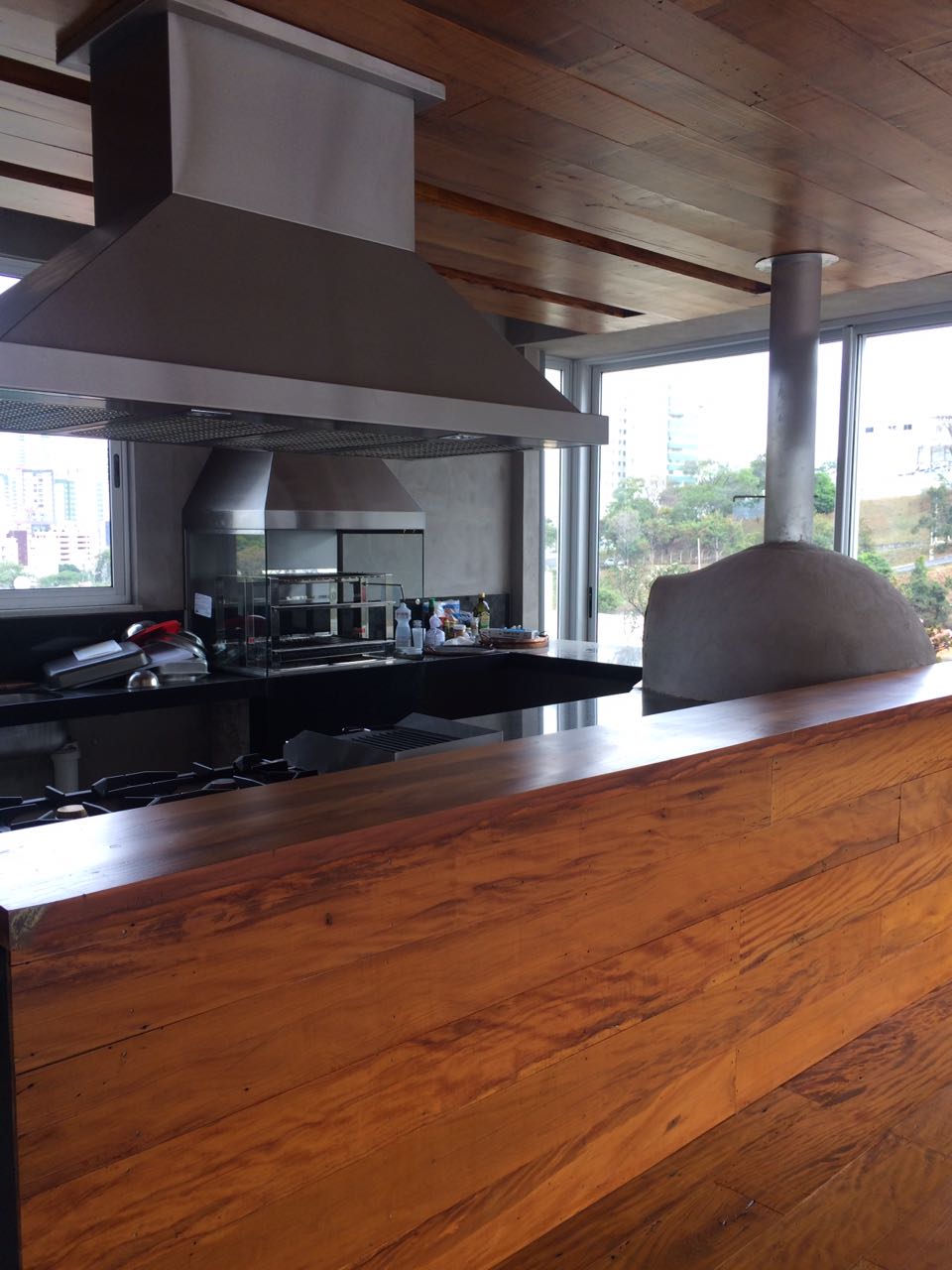 Obra para um espaço de cursos de culinária Gourmet com uma infraestrutura de alto padrão. Armários laqueados, madeira de demolição, freezers sob medida, balcões em grande escala sem emendas e coifas em inox dimensionadas especificamente para o espaço tornam esta área gourmet especial.