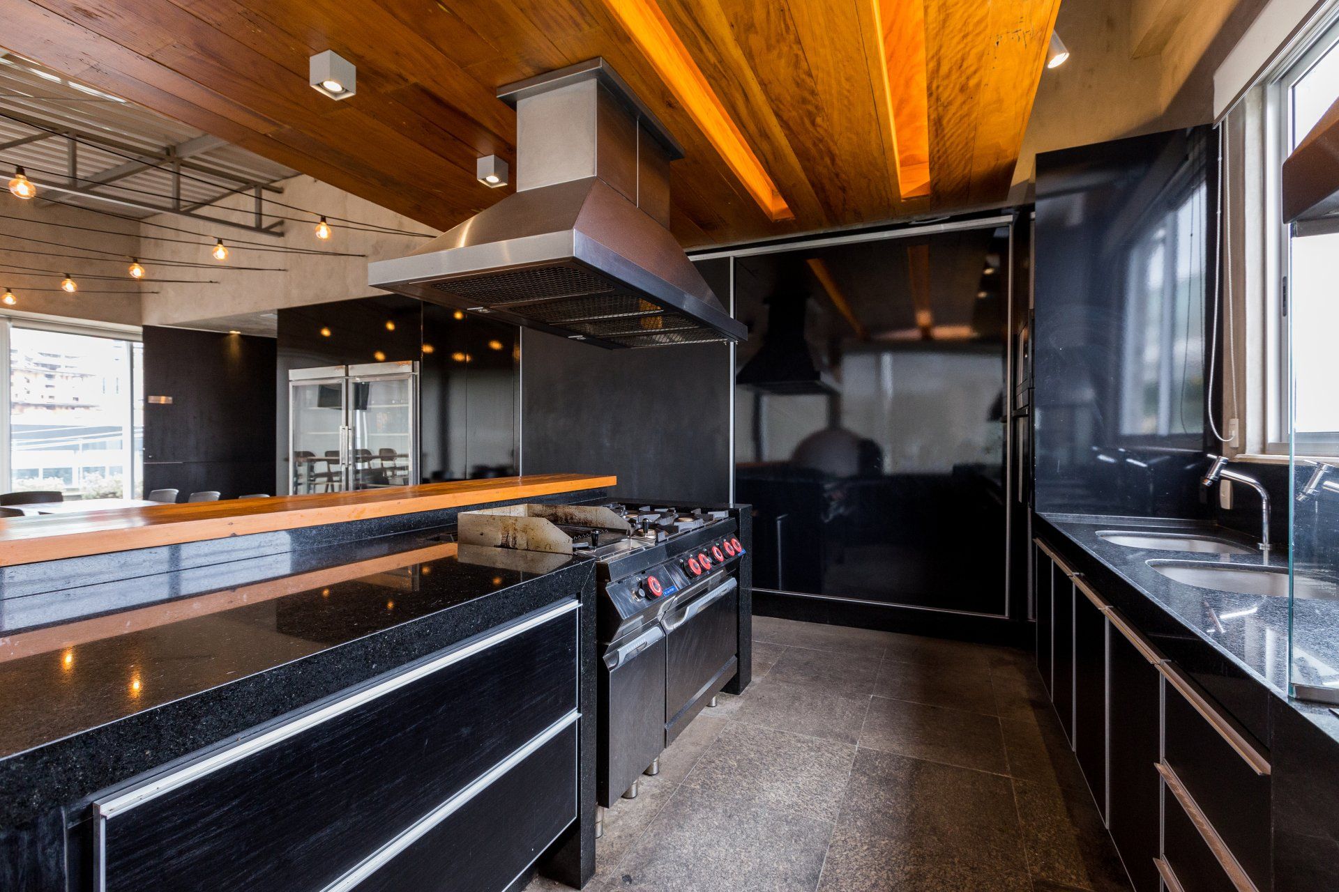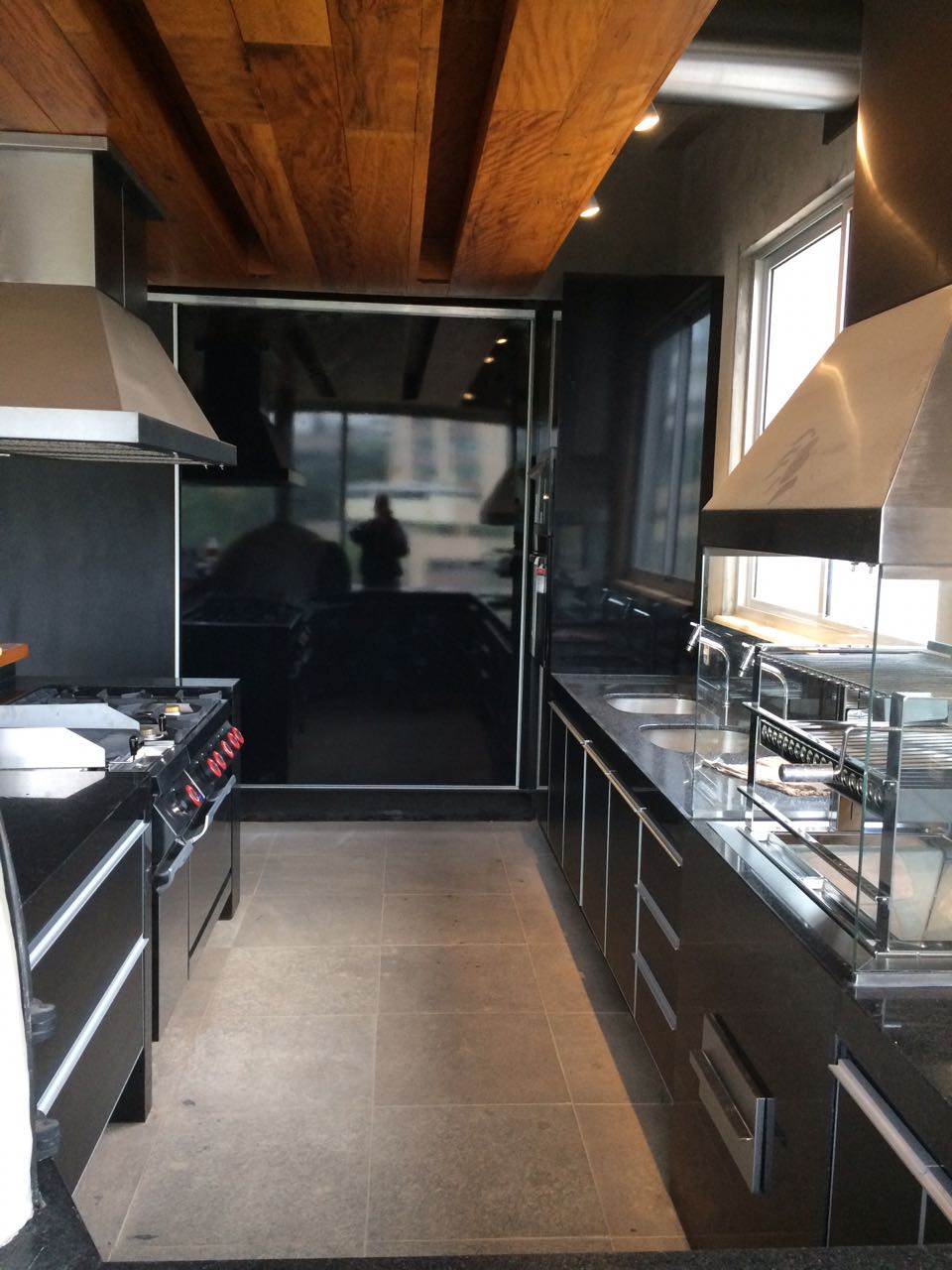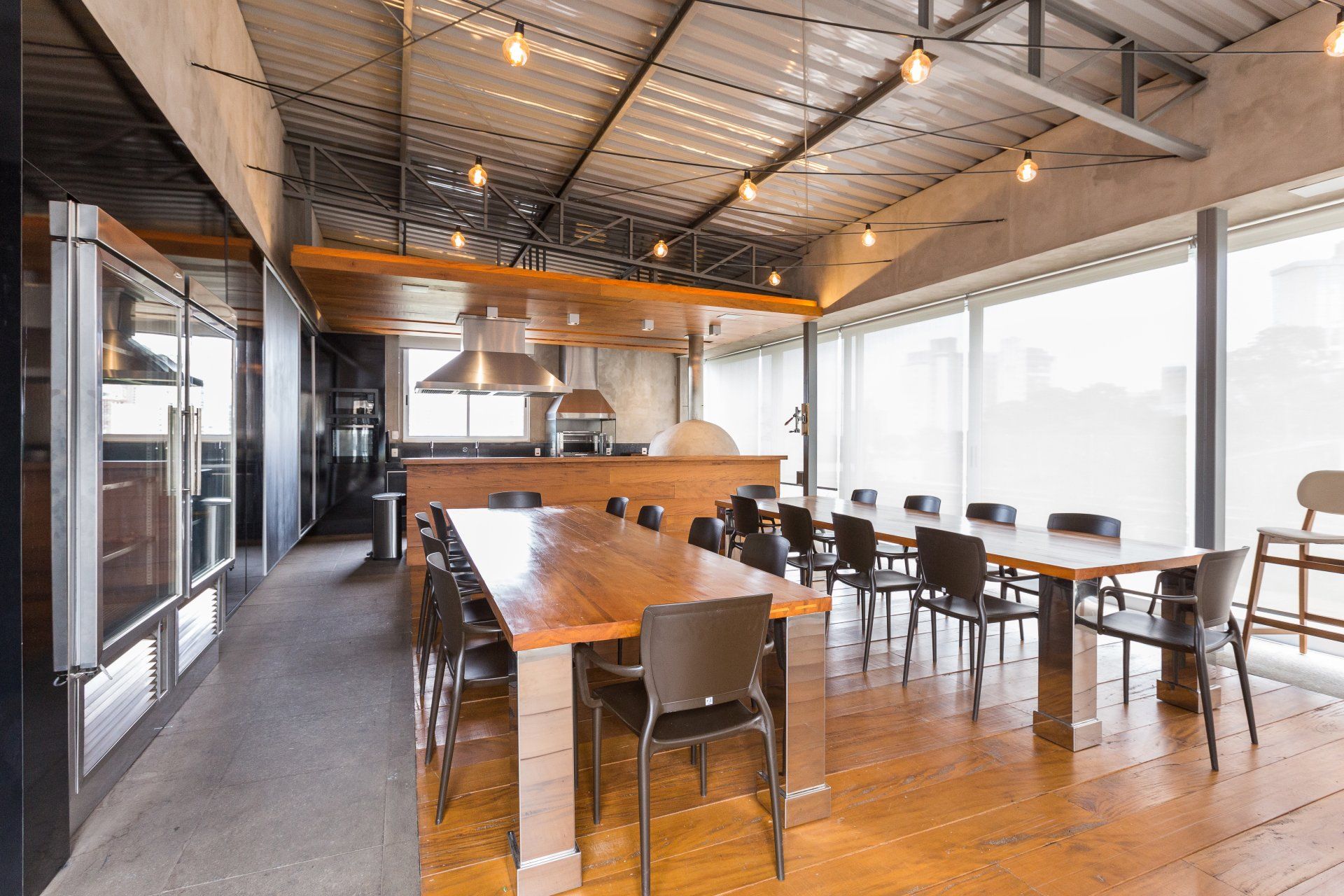 Obra para um espaço de cursos de culinária Gourmet com uma infraestrutura de alto padrão. Armários laqueados, madeira de demolição, freezers sob medida, balcões em grande escala sem emendas e coifas em inox dimensionadas especificamente para o espaço tornam esta área gourmet especial.