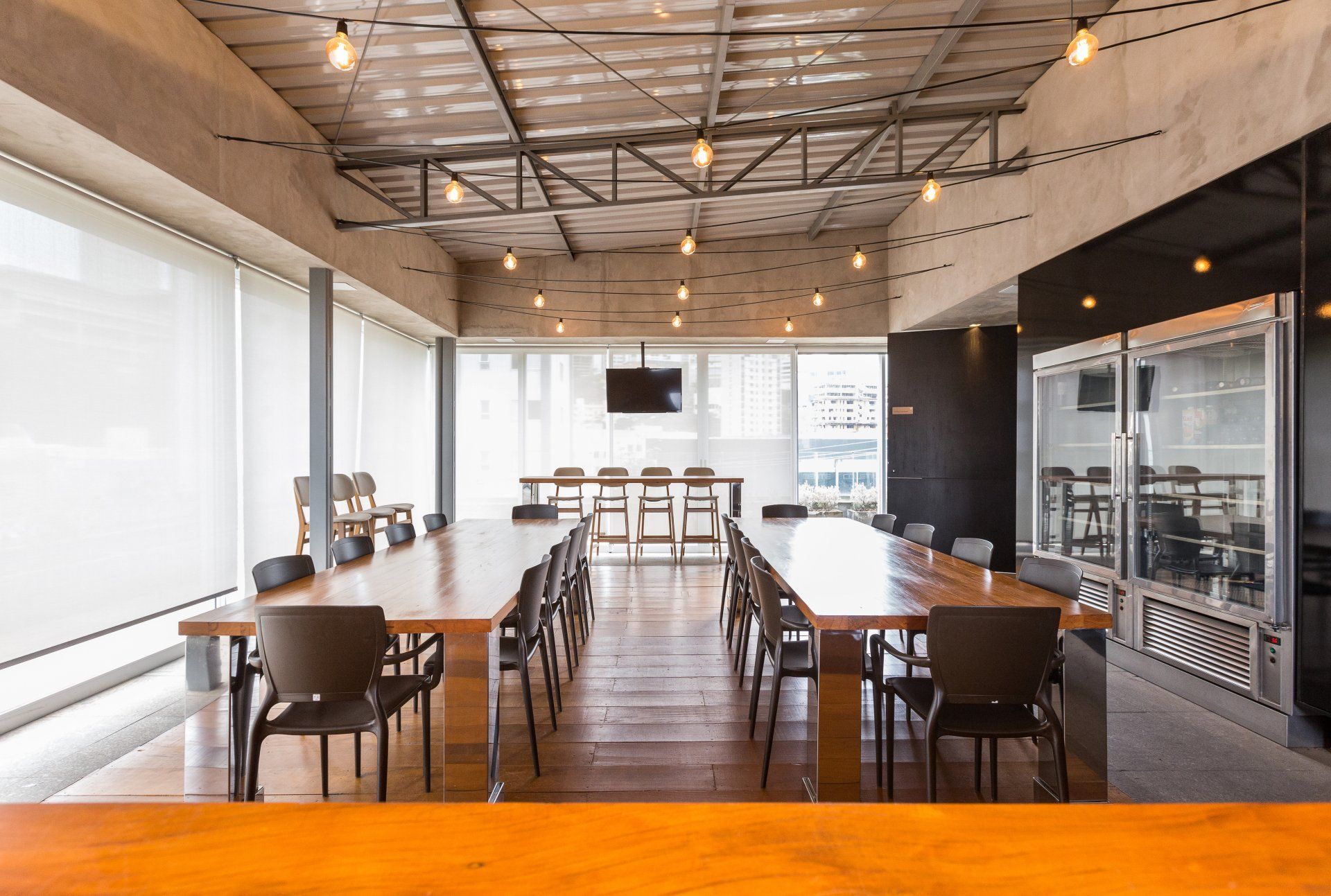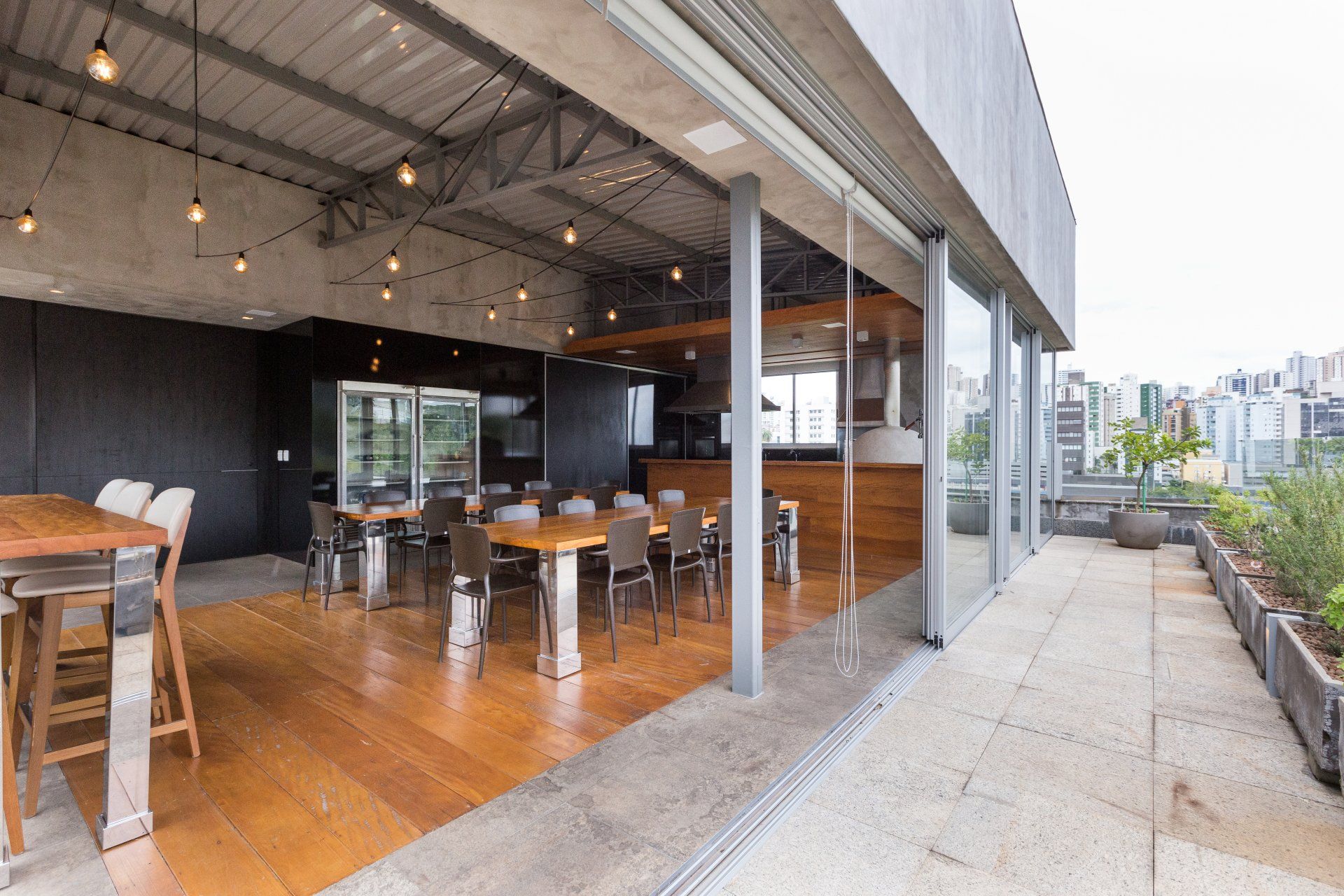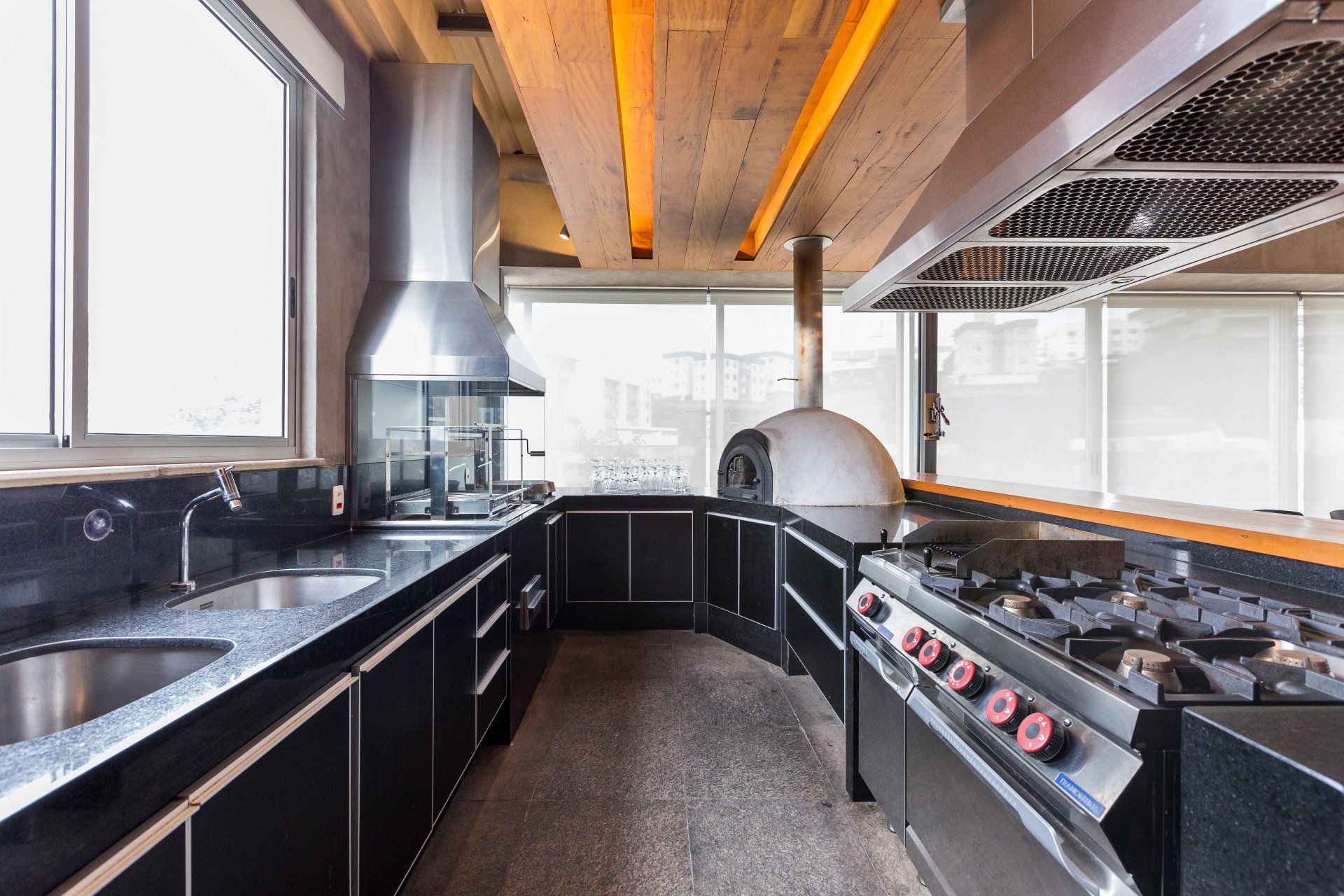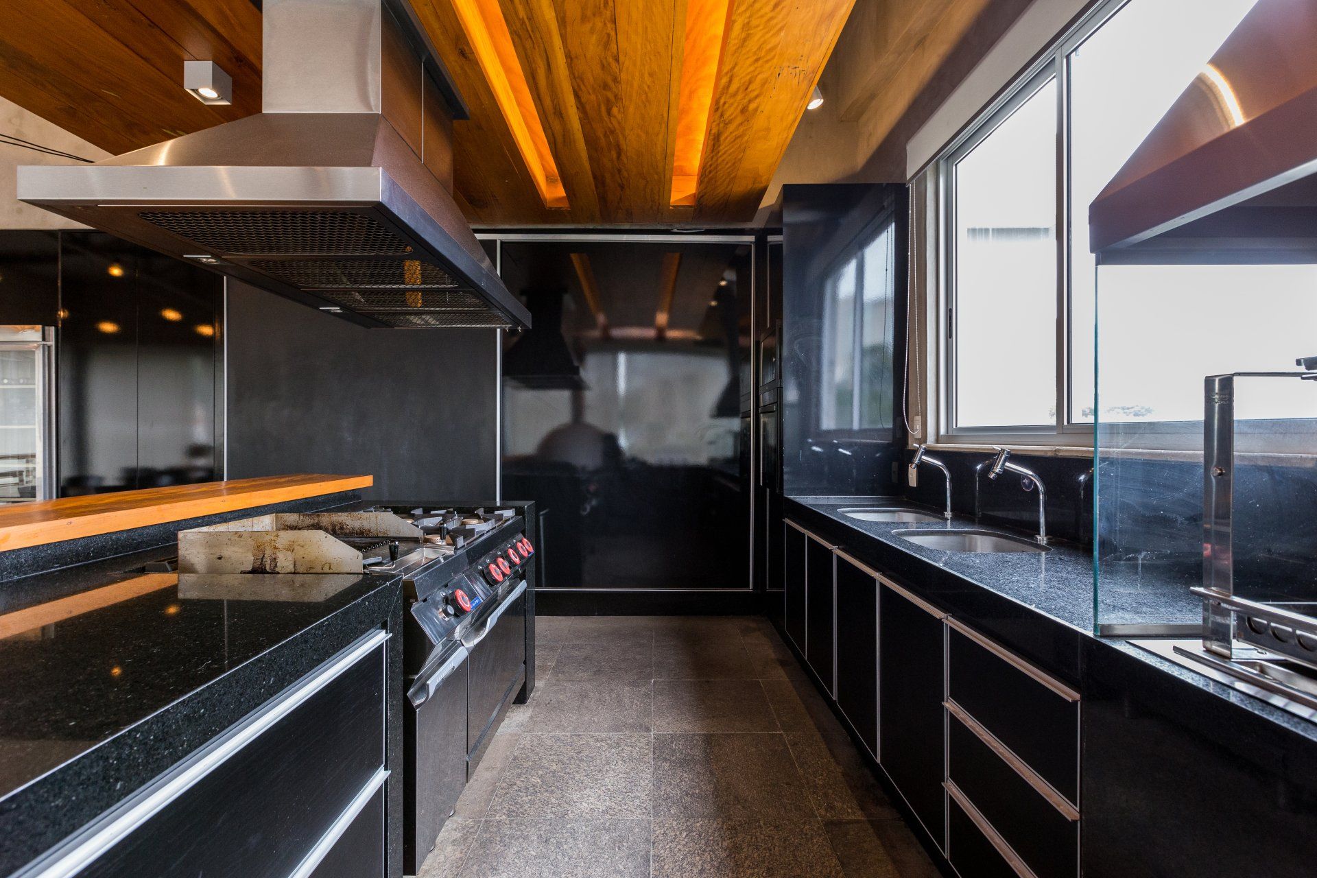 Obra para um espaço de cursos de culinária Gourmet com uma infraestrutura de alto padrão. Armários laqueados, madeira de demolição, freezers sob medida, balcões em grande escala sem emendas e coifas em inox dimensionadas especificamente para o espaço tornam esta área gourmet especial.