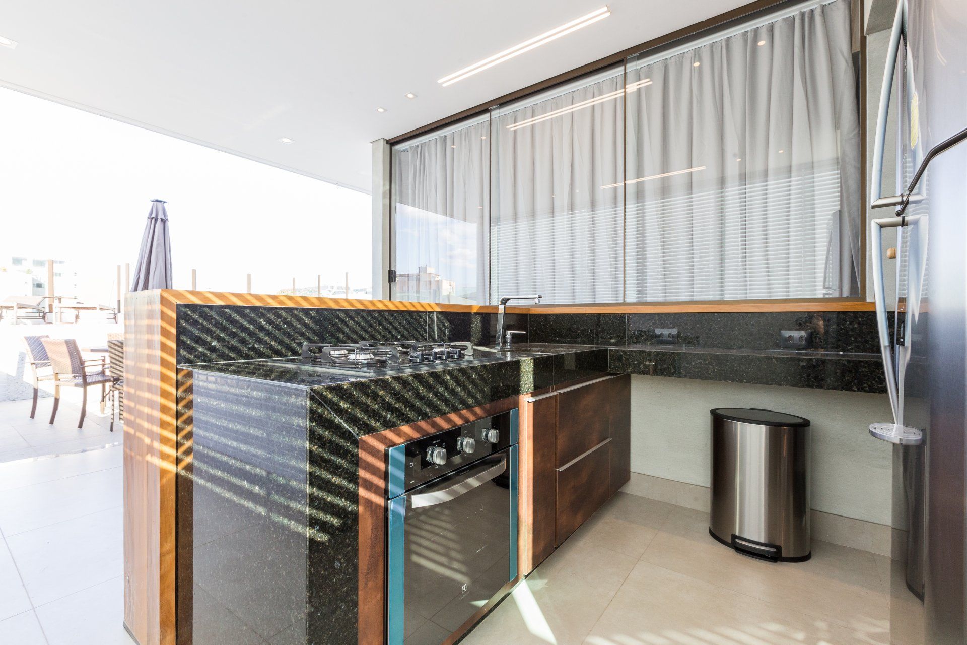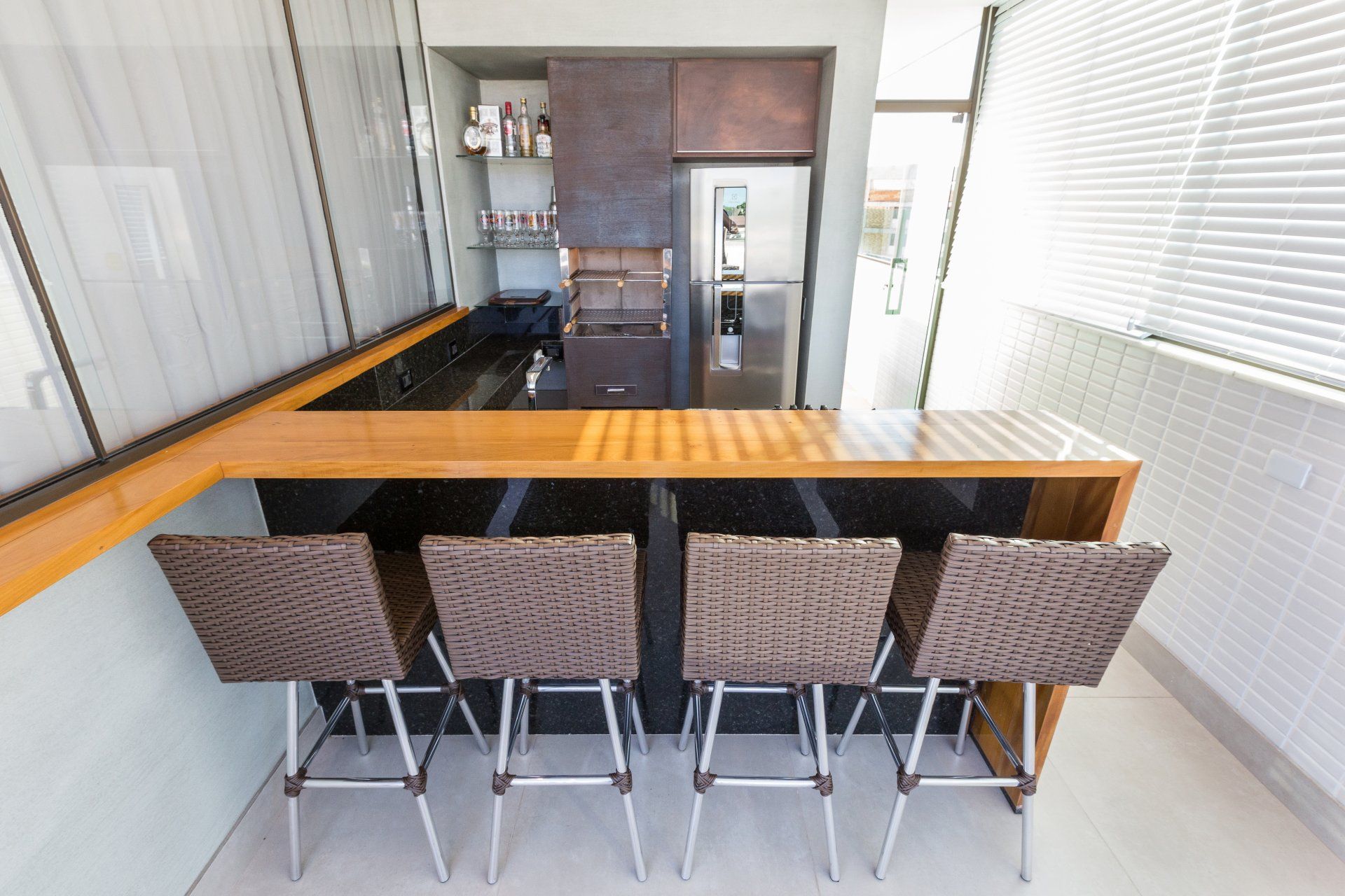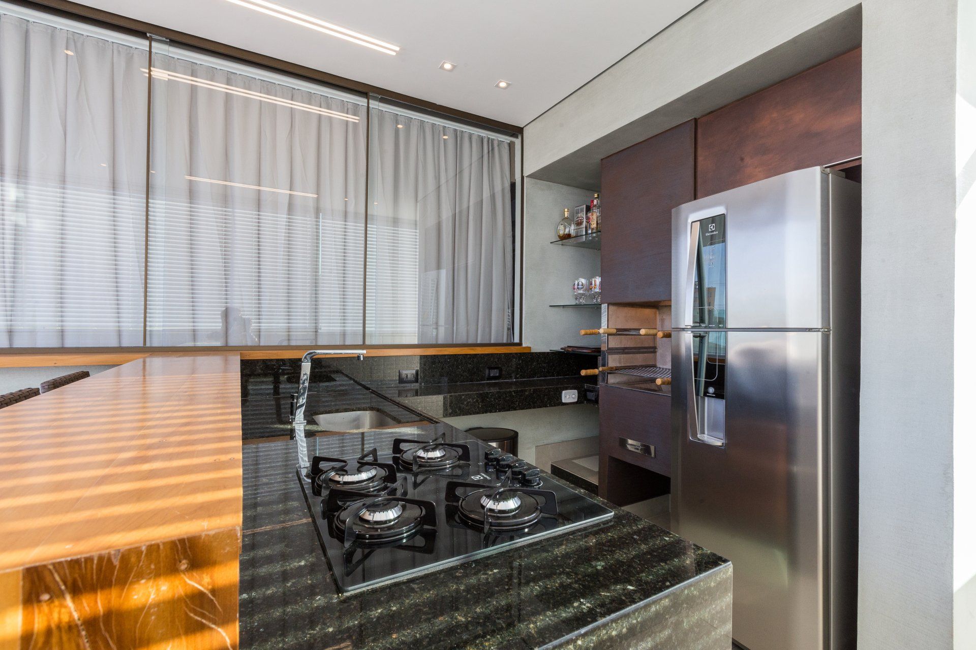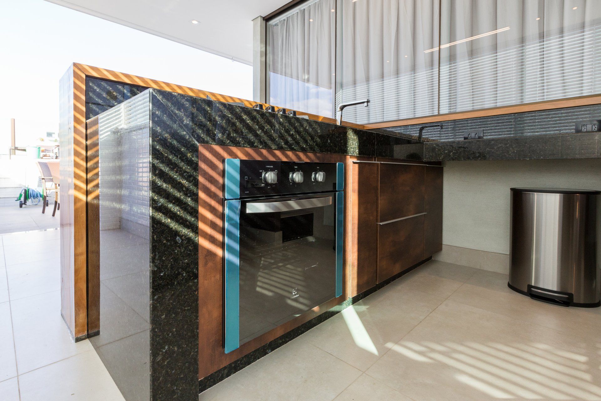 Área Gourmet em apartamento de cobertura, aplicação de textura que mimetiza aço Corten e madeira fazem parte da composição do ambiente.