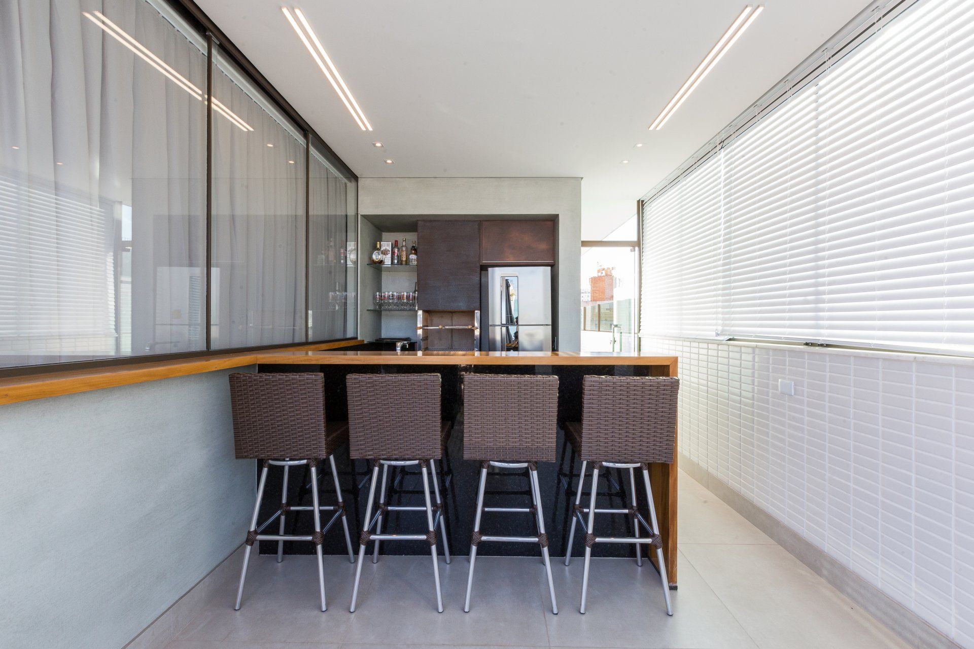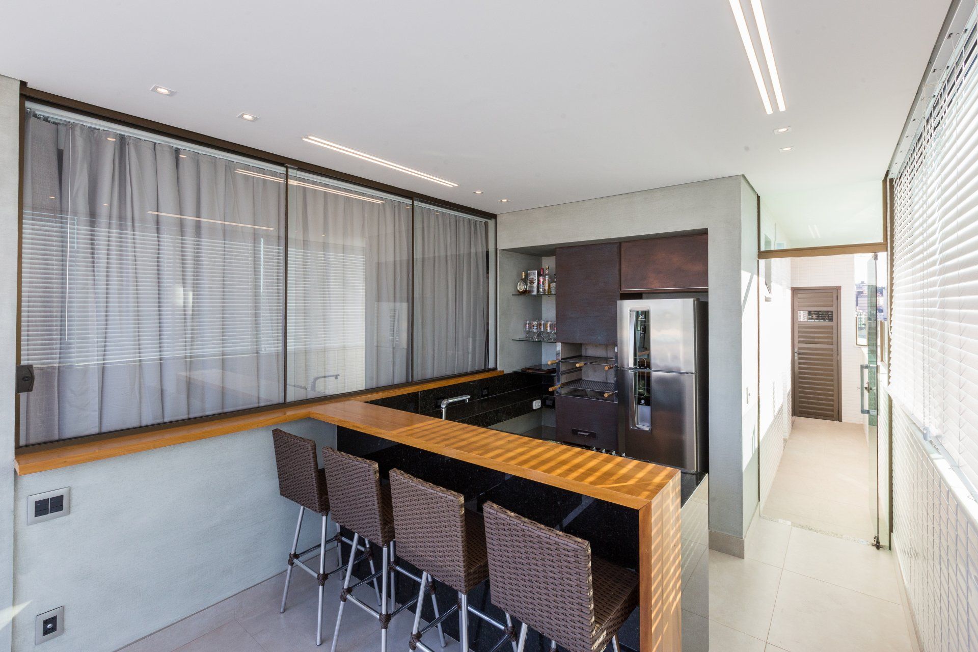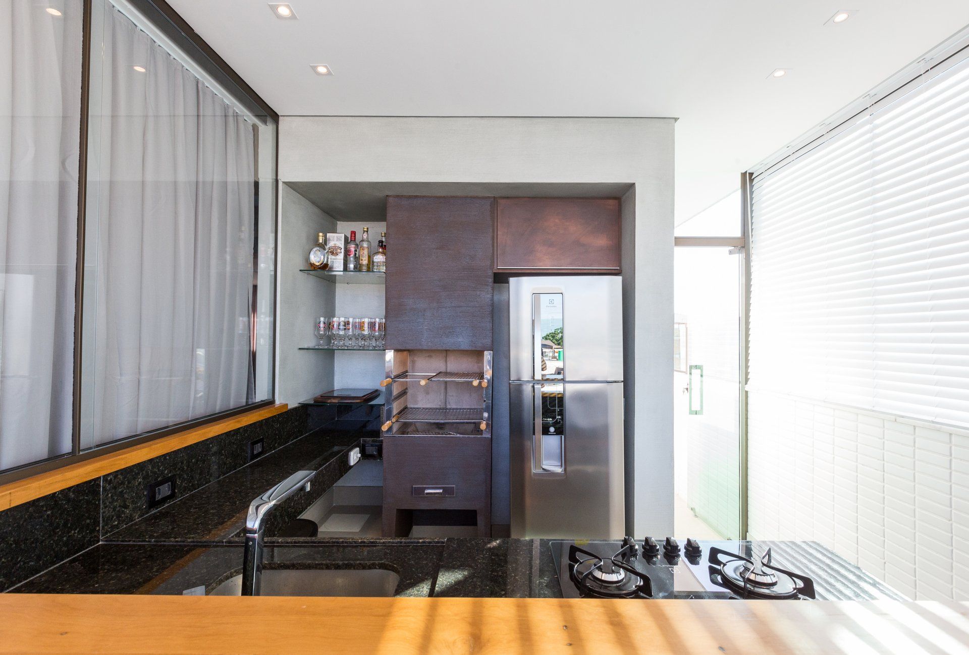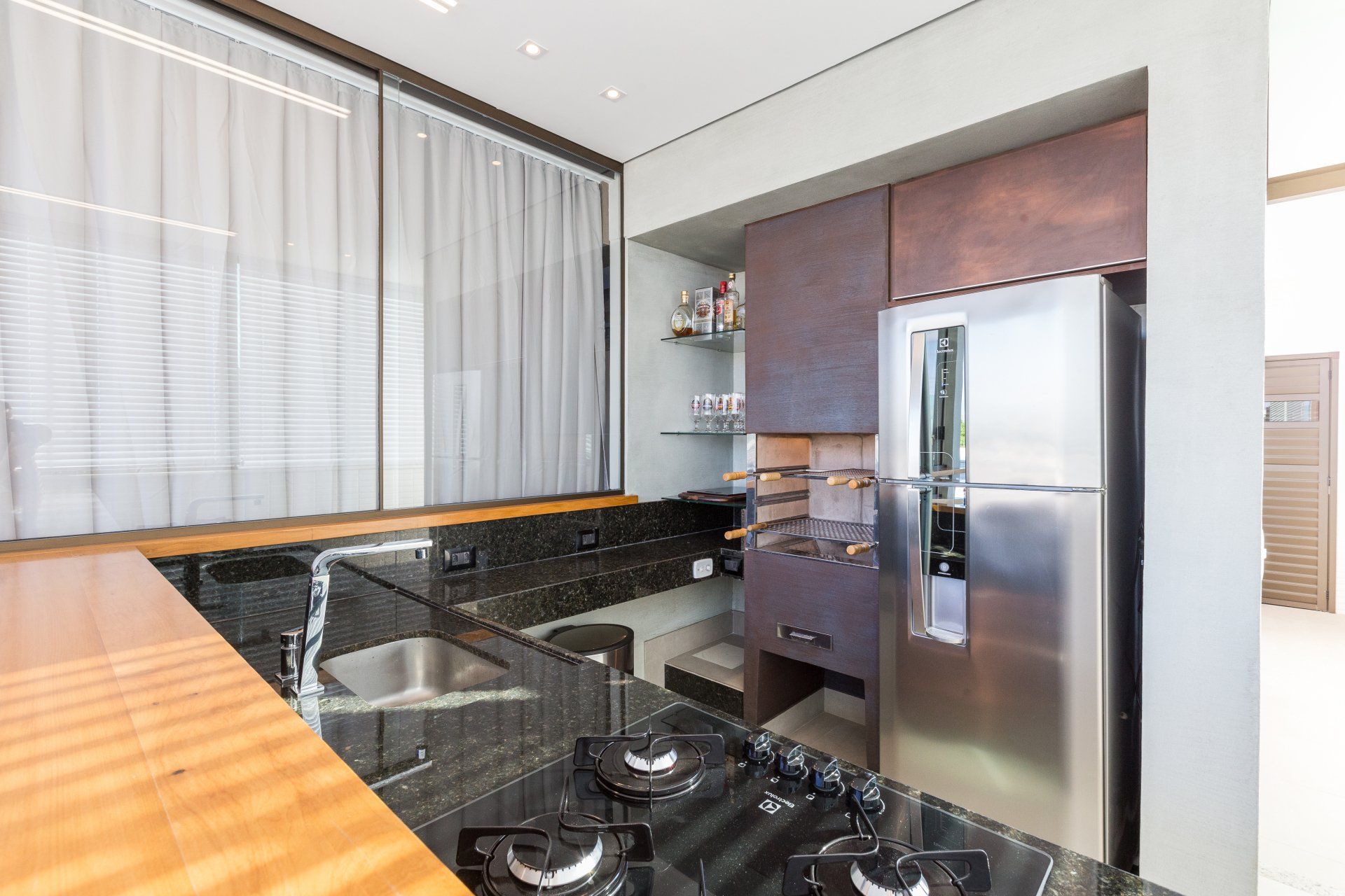 Área Gourmet em apartamento de cobertura, aplicação de textura que mimetiza aço Corten e madeira fazem parte da composição do ambiente.