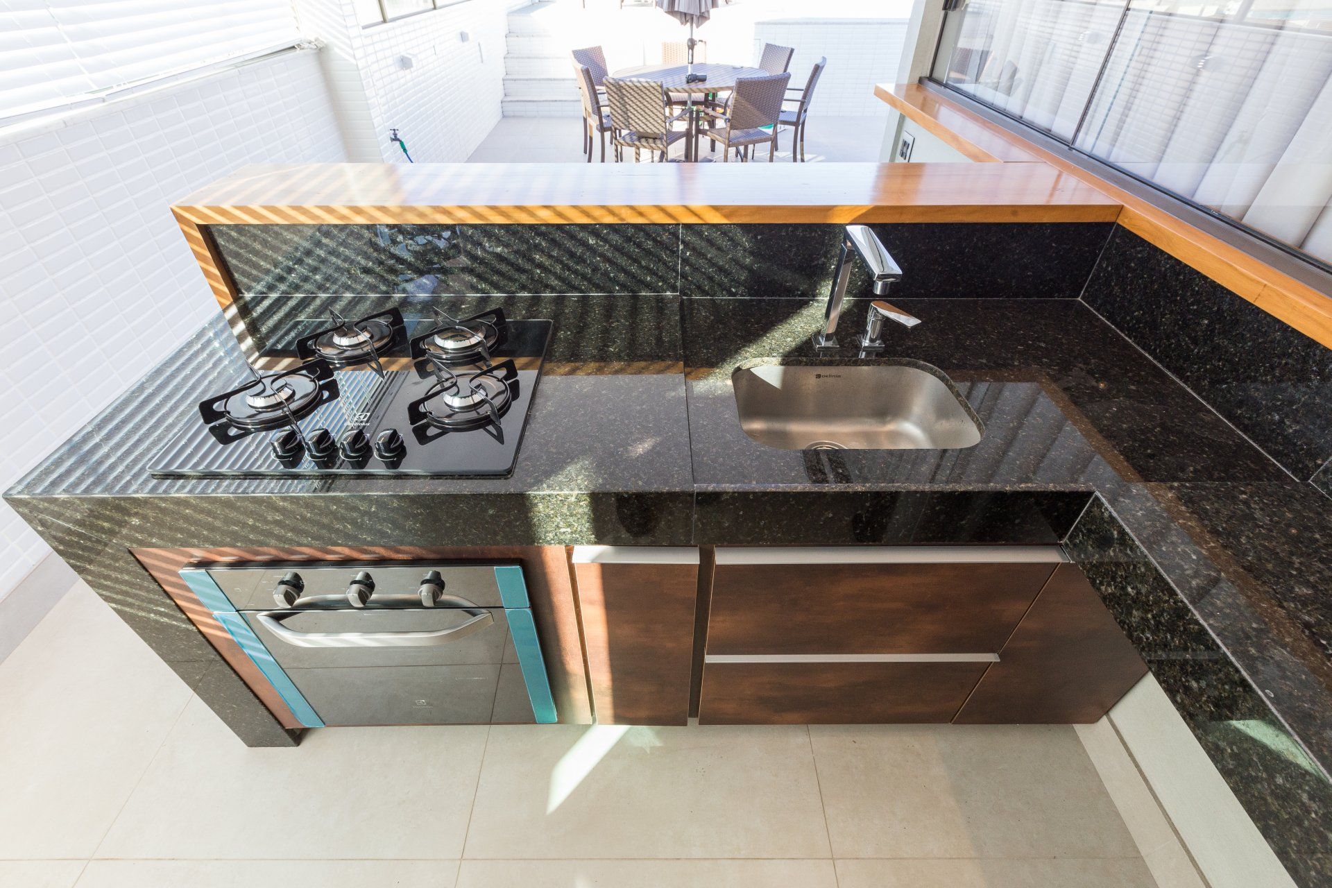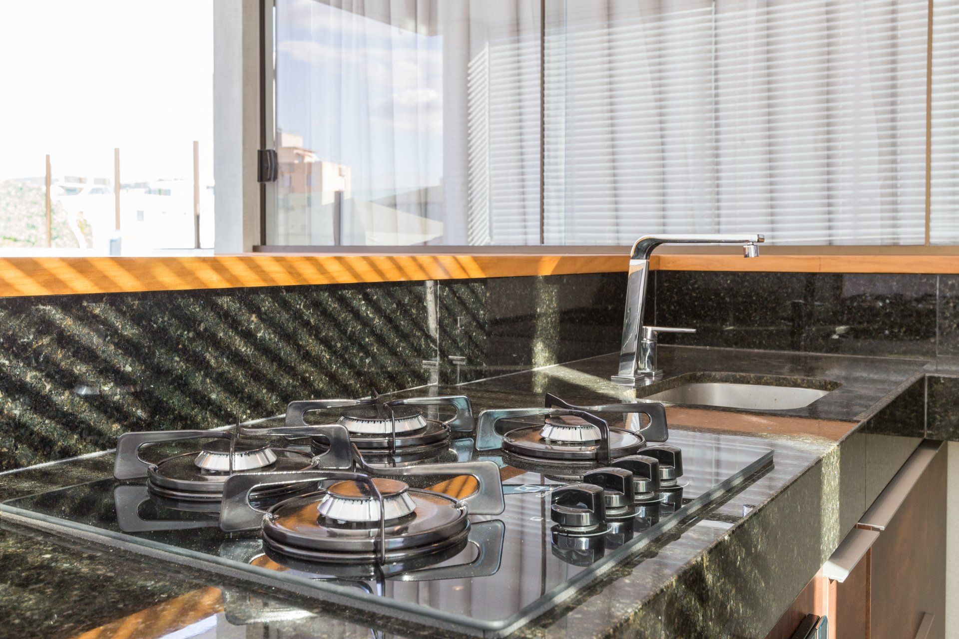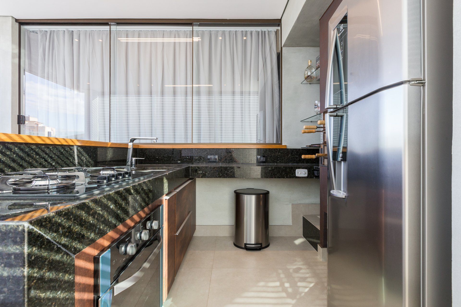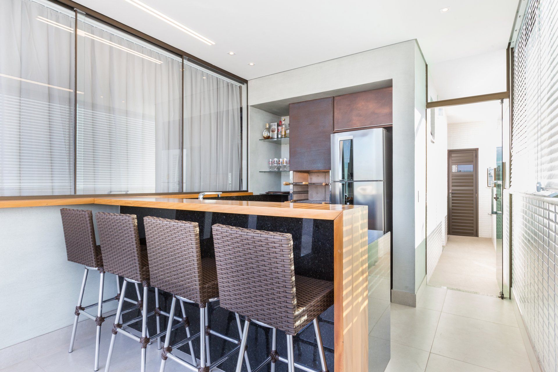 Área Gourmet em apartamento de cobertura, aplicação de textura que mimetiza aço Corten e madeira fazem parte da composição do ambiente.
